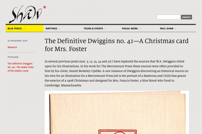 Sempre molto interessanti i post che Paul Shaw scrive — ovviamente in Inglese — sul suo Blue Pencil. Questa volta si parla di una illustrazione realizzata da W.A. Dwiggins — famoso type designer americano, calligrafo e progettista di copertine per libri — per una cartolina di Natale e dei riferimenti da lui utilizzati per realizzarla.