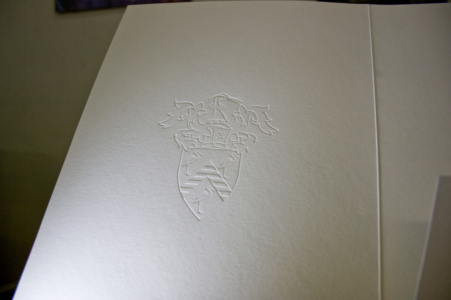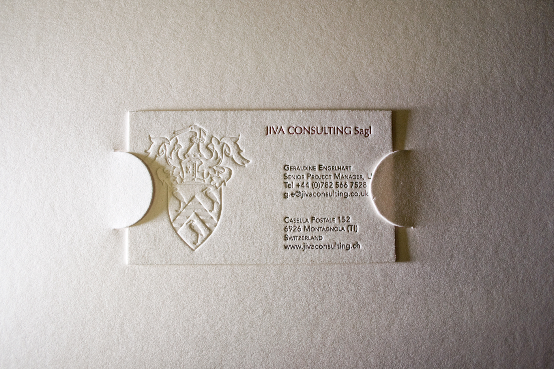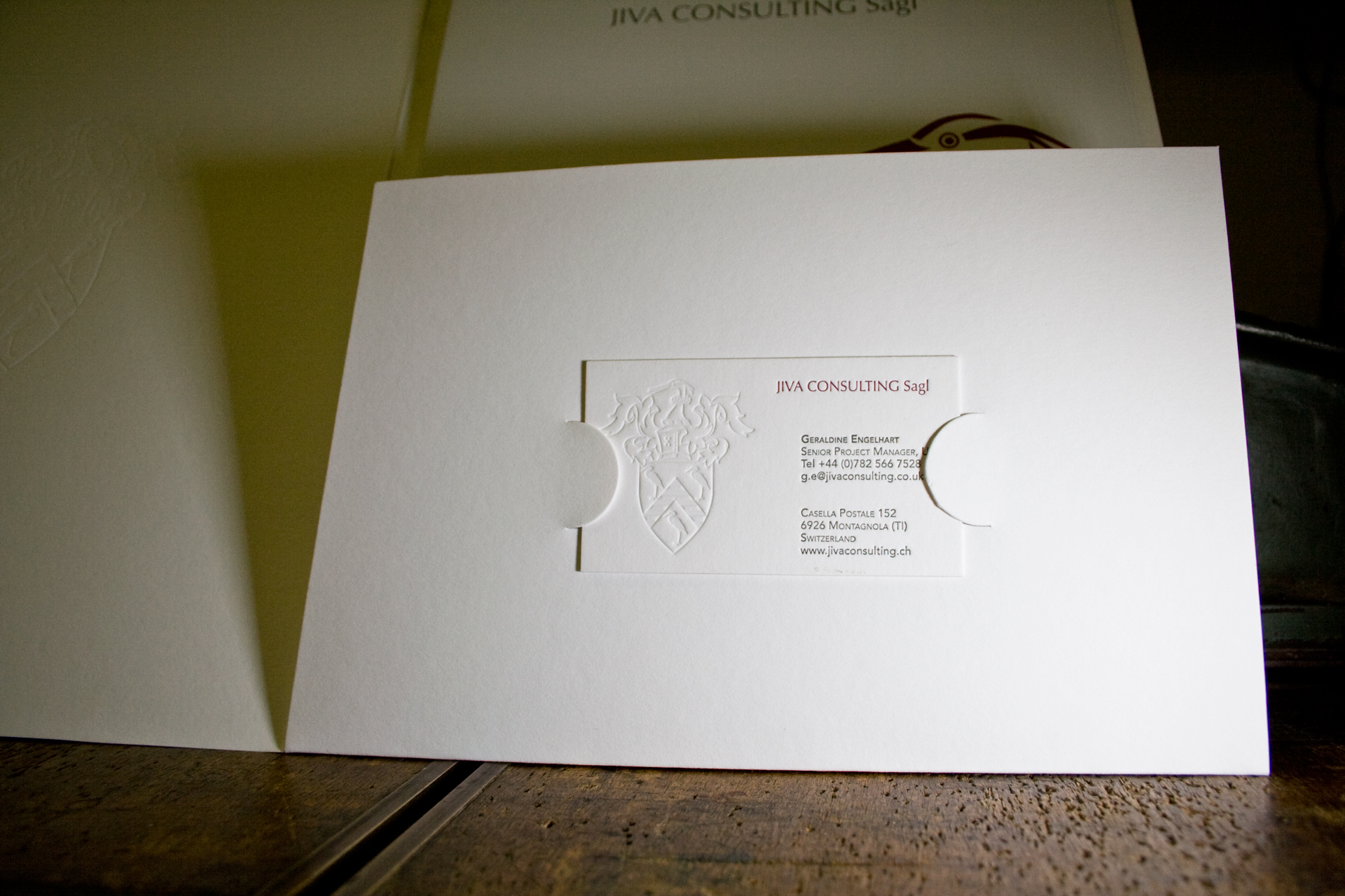 Biglietto da visita Formato: 8,5 x 5,5 cm Carta: Gmund Cotton 600 gr Stampa: letterpress (cliché) + stampa a secco (logo) Colori: 2 + 1 stampa a secco (logo) Cartellina portadocumenti Formato: A4 Carta: Gmund Cotton 300 gr Stampa: sbalzo a secco (logo sulla copertina) Altre lavorazioni: fustellatura per piega e tasca porta biglietto Brochure…