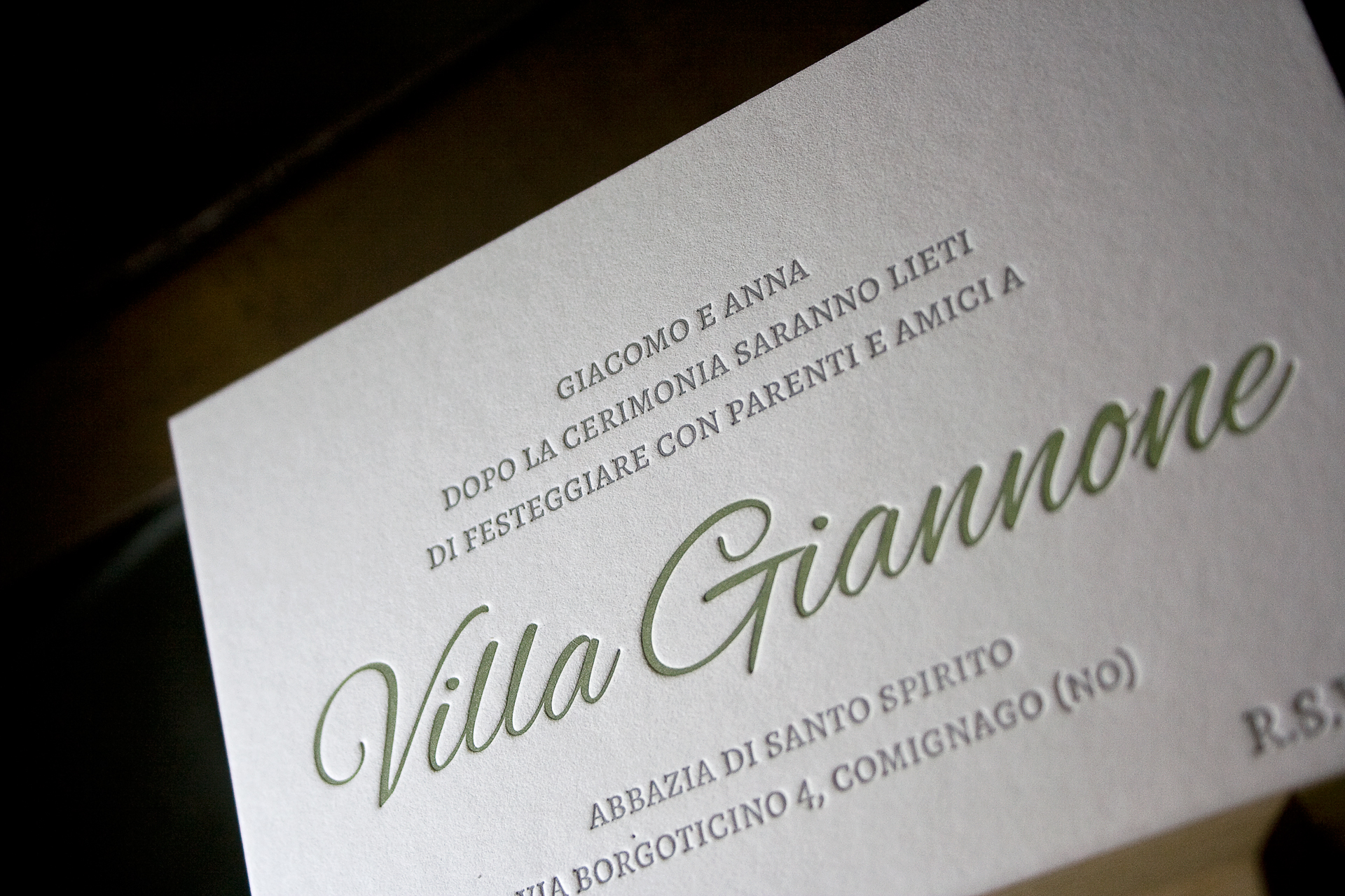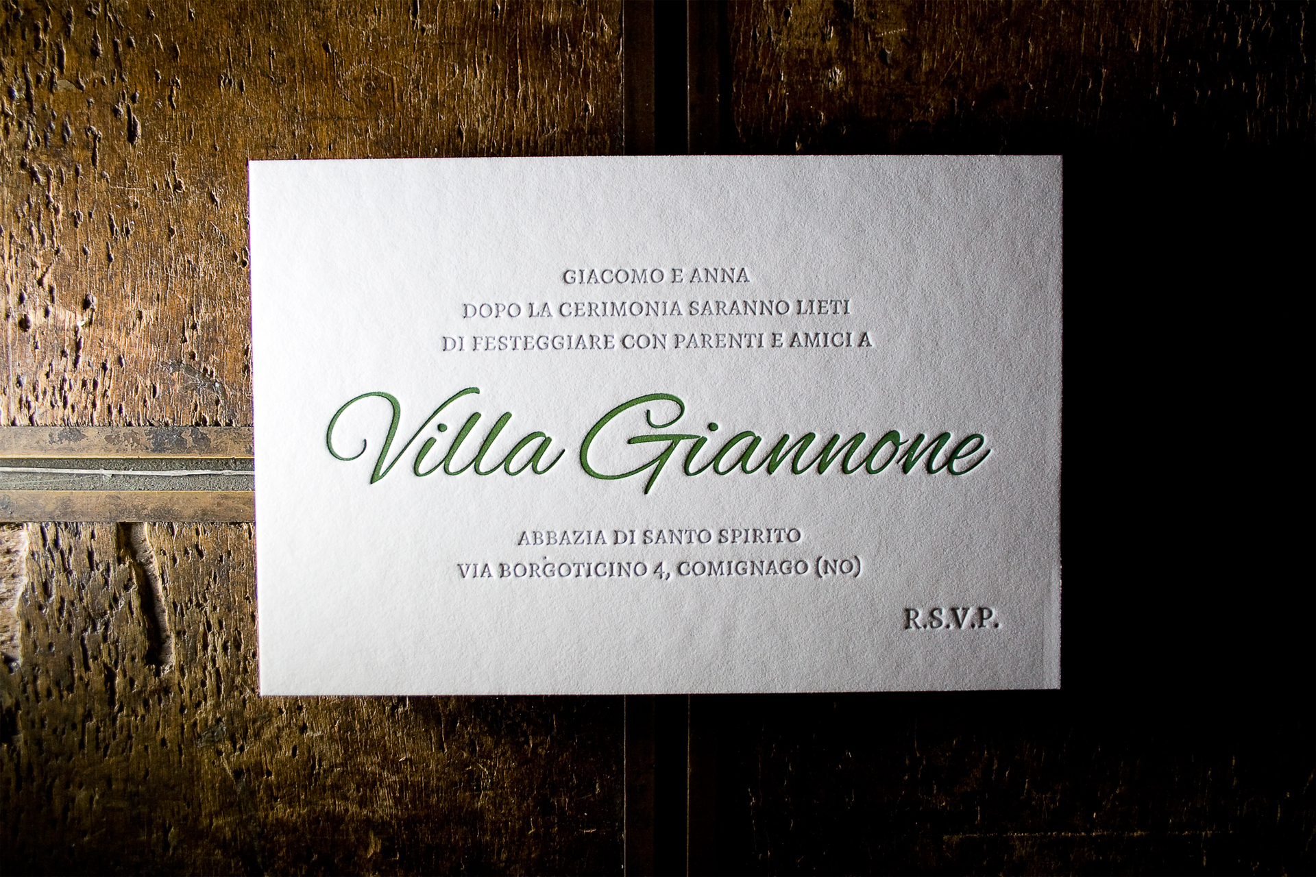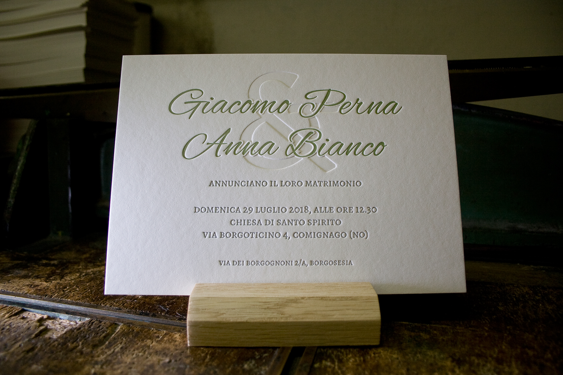 Partecipazione di matrimonio Formato: 12 x 18 cm Carta: Gmund Cotton Linen Cream 300 gr Stampa fronte: digitale Stampa retro: letterpress (cliché) Colori retro: 1 colore Altre lavorazioni: accoppiamento carta fronte e retro Buste Buste fatte a mano Carta: misto cotone 150 gr Colore: verde