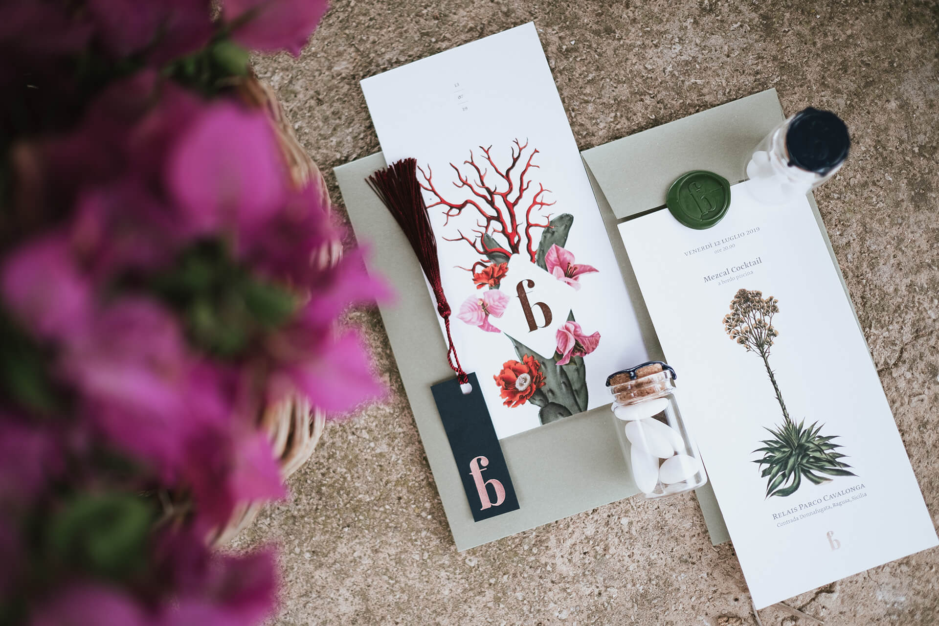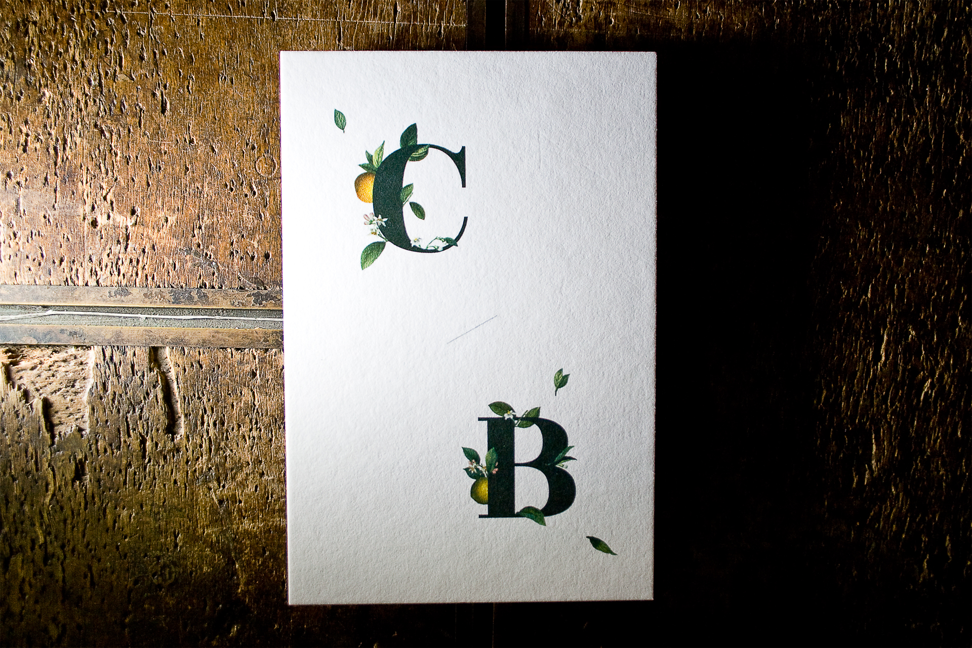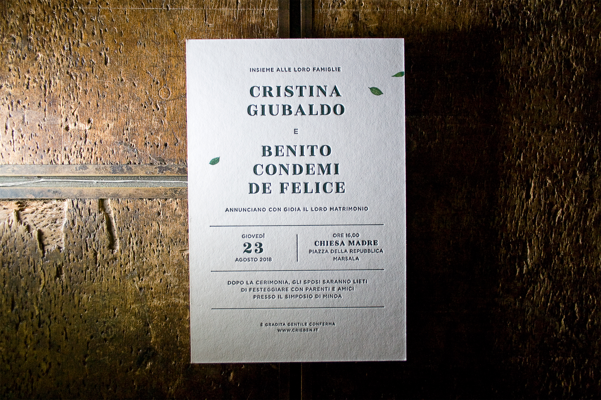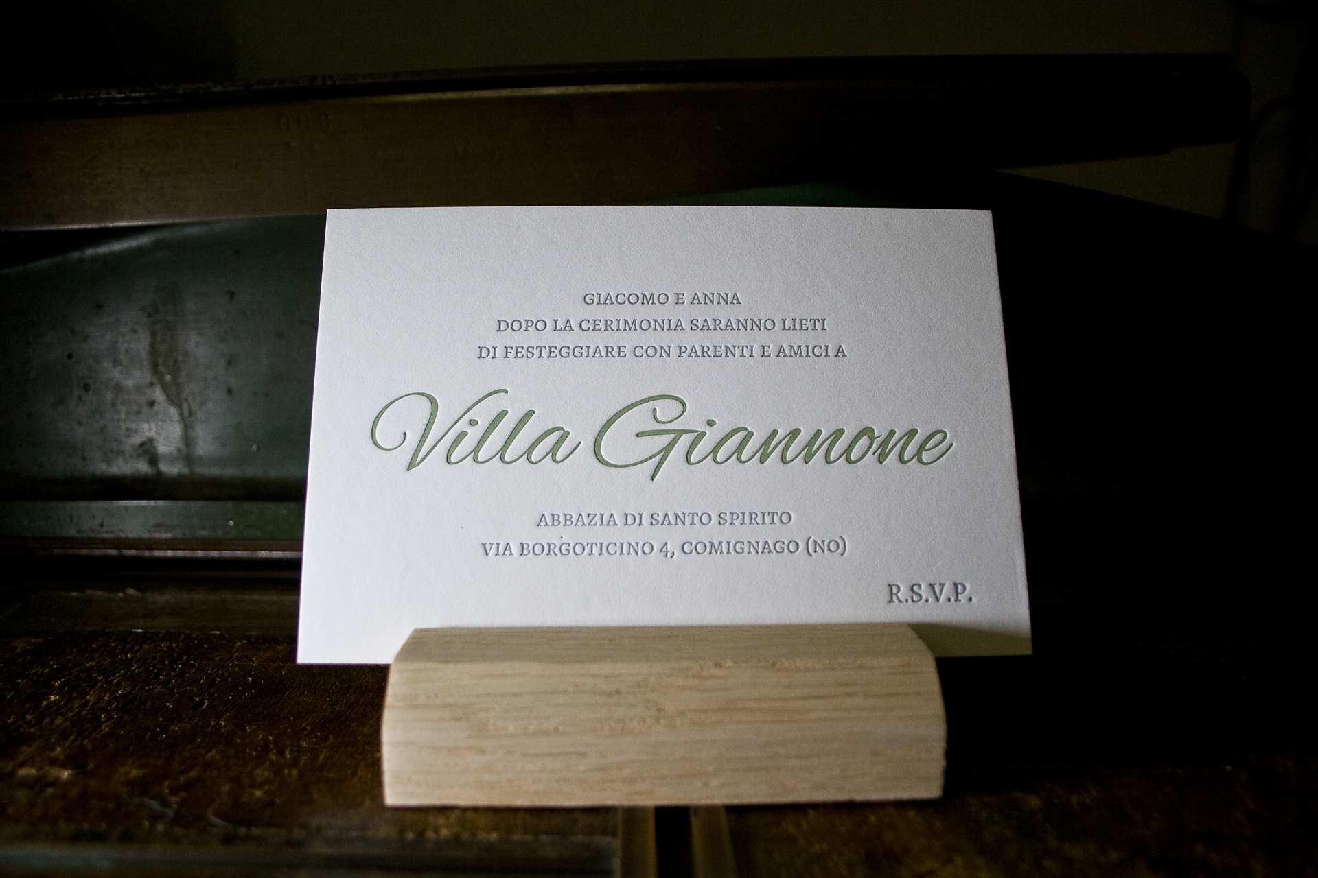 Partecipazione di matrimonio Formato: 12 x 18 cm Carta: Gmund Cotton Linen Cream 300 gr Stampa fronte: digitale Stampa retro: letterpress (cliché) Colori retro: 1 colore Altre lavorazioni: accoppiamento carta fronte e retro Buste Buste fatte a mano Carta: misto cotone 150 gr Colore: verde