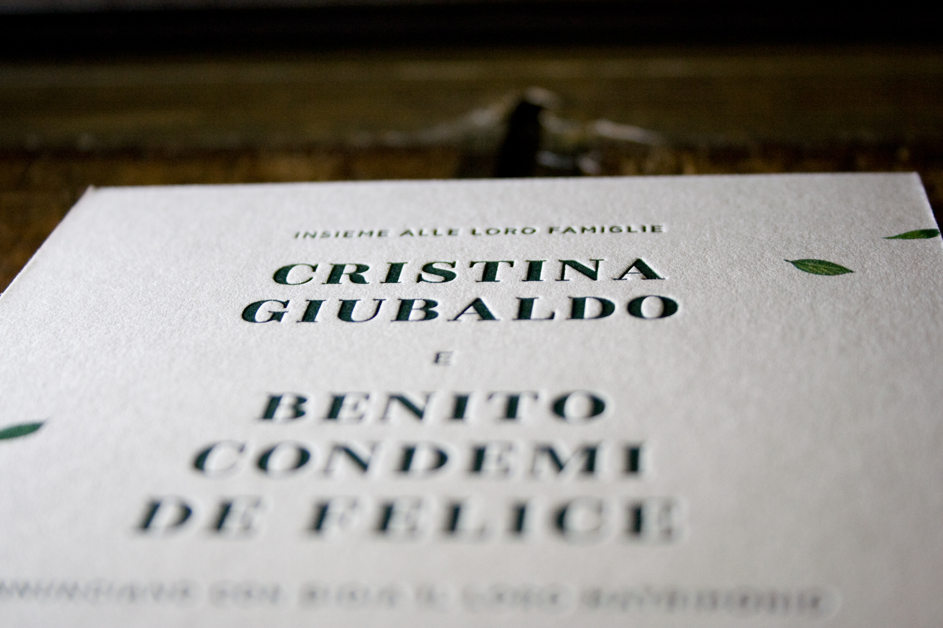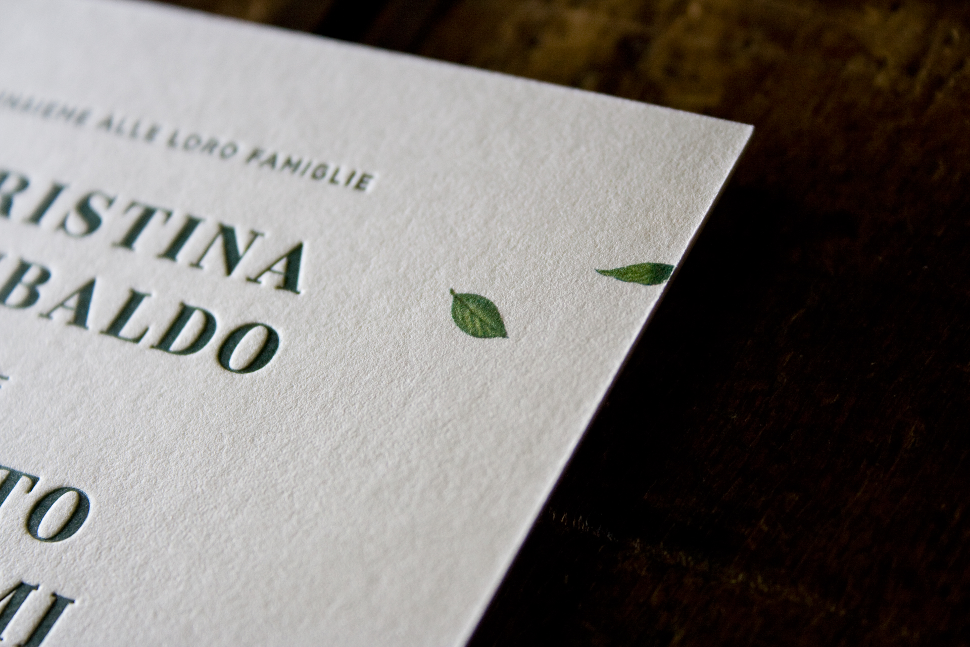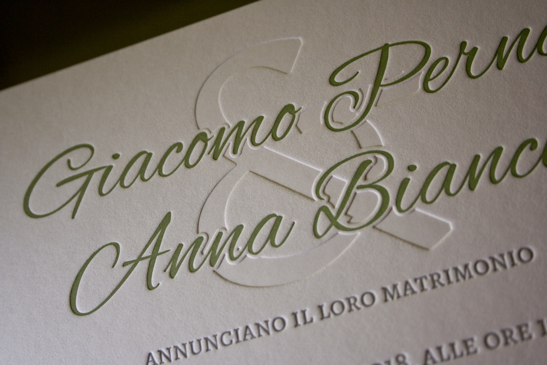 Partecipazioni di nozze Formato: 15 x 21 cm Carta: Gmund Cotton Linen Cream 600 gr Stampa: letterpress (cliché) + stampa a secco Colori: 2 (letterpress) + 1 stampa a secco Invito ricevimento Formato: 10 x 15 cm Carta: Gmund Cotton Linen Cream 600 gr Stampa: letterpress (cliché) Colori: 2 Buste Carta: misto cotone Altre lavorazioni:…