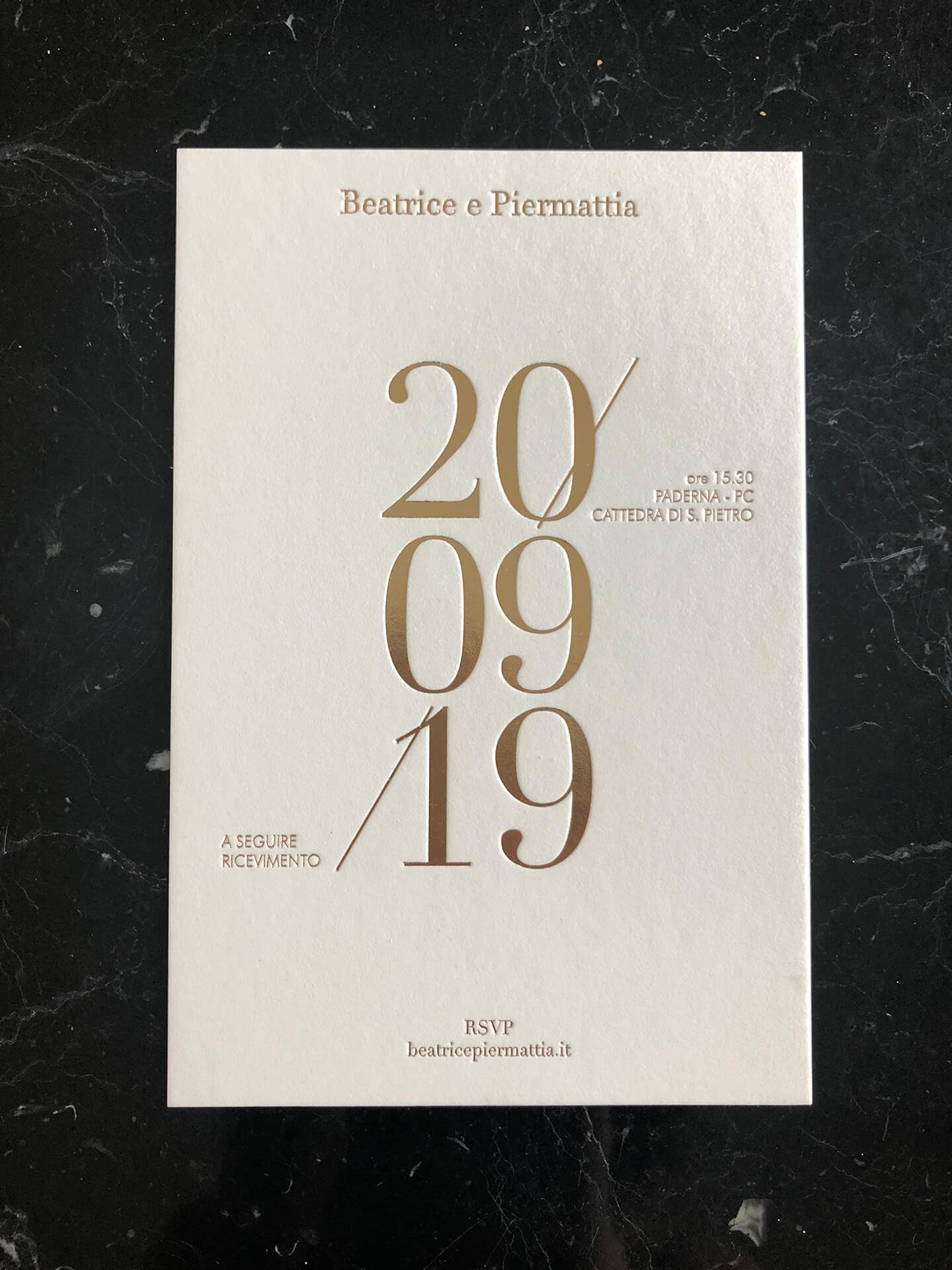 Partecipazione di matrimonio Carta: Gmund Cotton 300 gr Stampa: letterpress grigio + lamina oro a caldo rosa + digitale in HD Colori: 2 (lamina color oro rosa + letterpress grigio) Altre lavorazioni: accoppiamento carta Invito Carta: Gmund Cotton 300 gr Stampa: letterpress grigio + lamina oro a caldo rosa + digitale in HD Colori: 2…