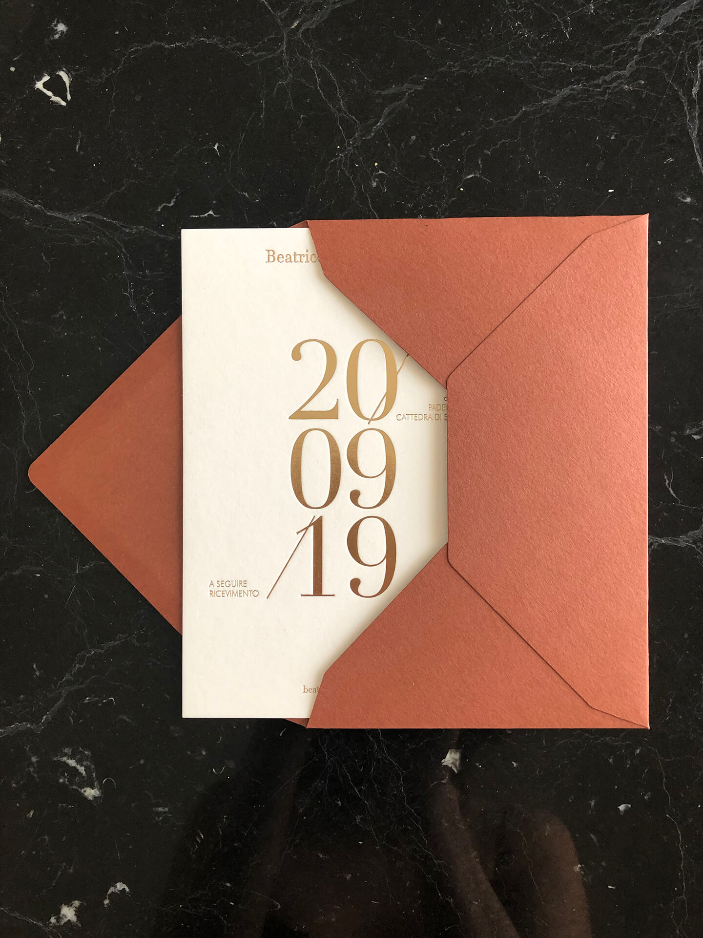 Partecipazione di matrimonio Formato: 12 x 18 cm Carta: Gmund Cotton Linen Cream 600 gr Stampa: letterpress (cliché) con lamina a caldo Colori: 1 (lamina color oro rosa) Buste Buste fatte a mano Carta: Gmund 180 gr