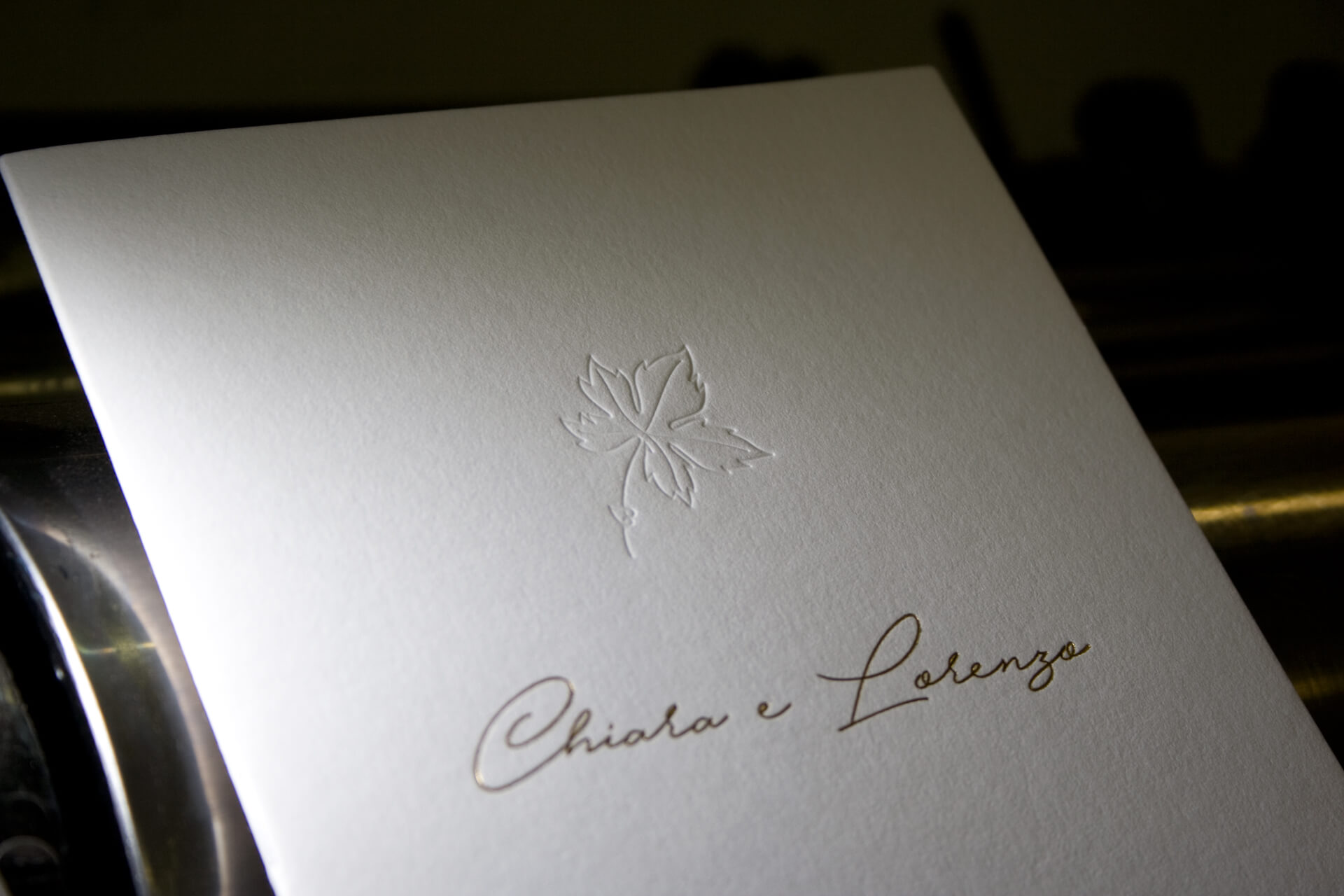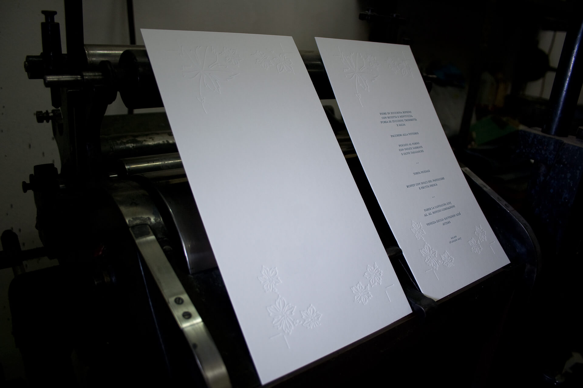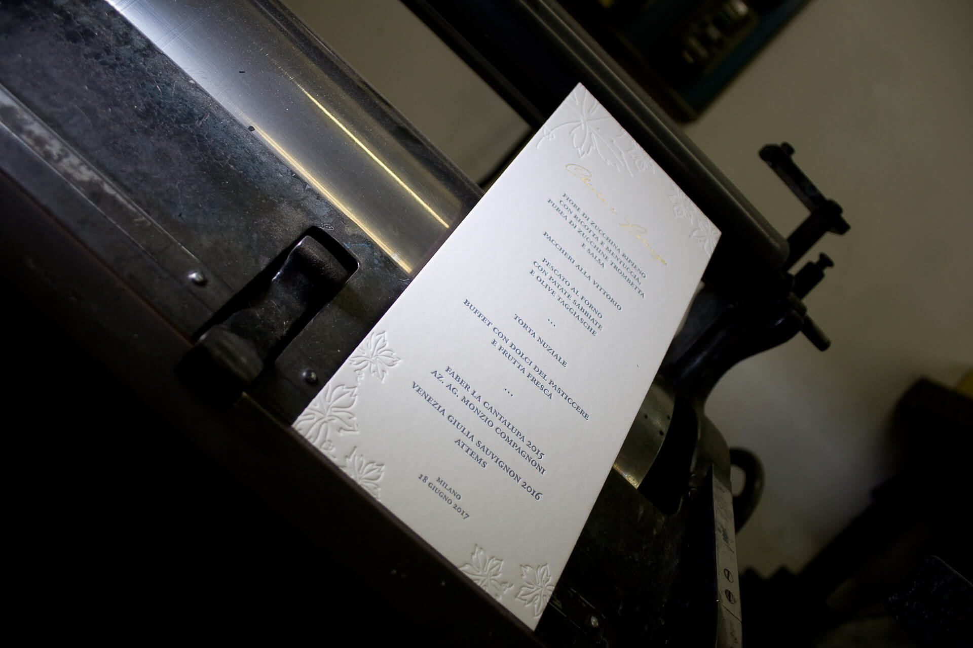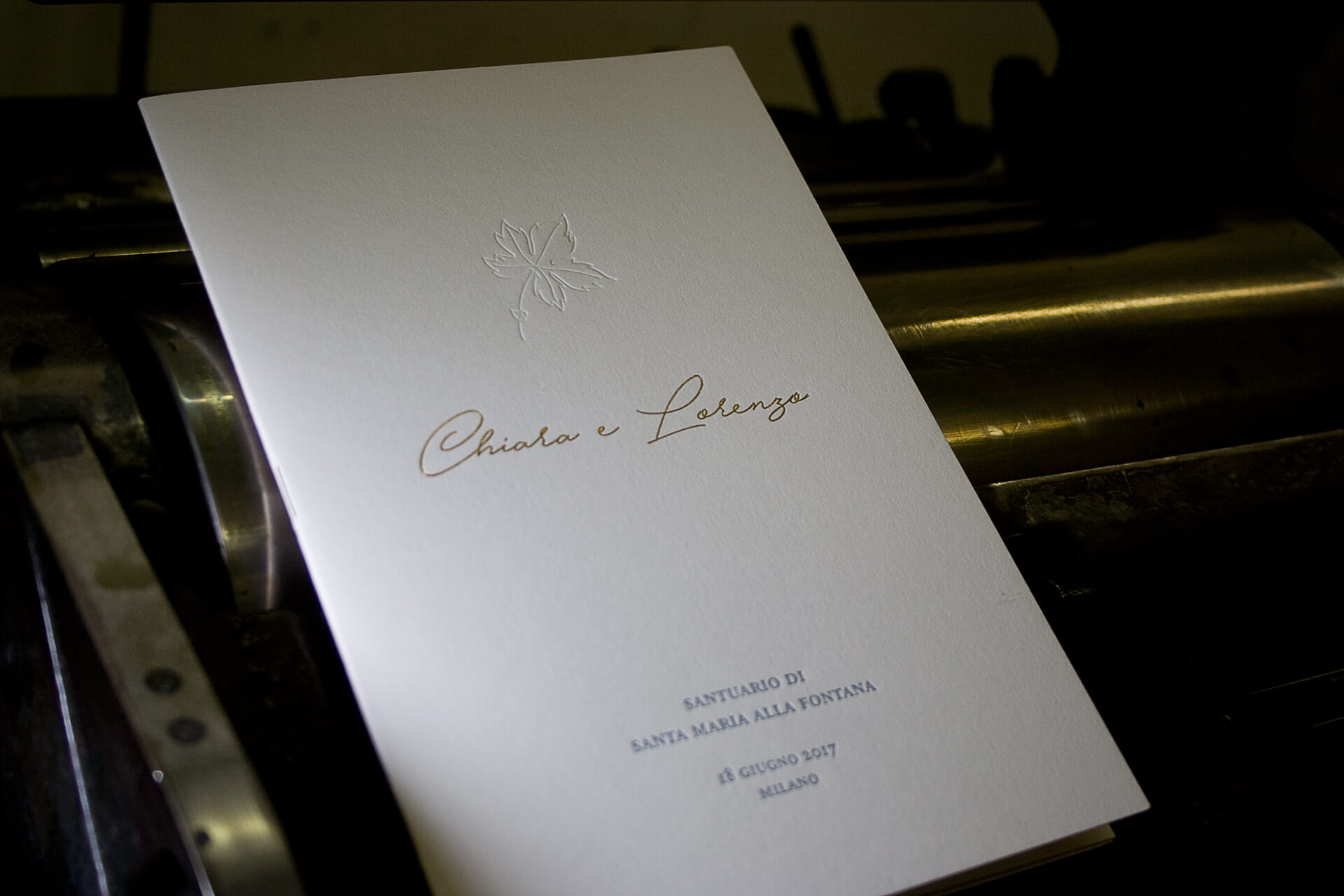 Libretto messa Formato: A5 Carta: Gmund Cotton Linen Cream 600 gr Stampa: letterpress (cliché) + stampa oro a caldo + stampa a secco Colori: 2 (grigio e oro a caldo) + 1 stampa a secco Menu ricevimento Formato: 11×24 cm Carta: Gmund Cotton Linen Cream 600 gr Stampa: letterpress (cliché) + stampa oro a caldo…